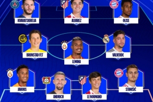 全文摘要:欧足联官方公布了欧冠1/8决赛首回合最佳阵容。该阵容由库尔图瓦把门,巴尔韦德领衔中场,K77(克瓦拉茨赫利亚)、小蜘蛛(阿尔瓦雷斯)和奥利塞组成进攻三叉戟。入选球员来自皇马、拜仁、马竞及勒沃库森等豪门球队。