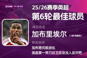 全文摘要:2025-2026赛季英超第六轮最佳球员评选结果出炉。阿森纳后卫加布里埃尔凭借补时阶段的头球绝杀,帮助球队2-1战胜纽卡斯尔。他凭借出色的表现获得8万吧友支持,力压哈兰德当选本轮最佳球员。