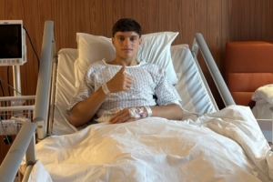 莱奥尼晒出在病床上的照片,配文:“手术完成,感谢大家的祝福信息,我会很快回归。”