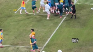 赛后有球迷拍到刘殿座站在原地有些落寞,钟义浩过来跳起来抱刘殿座。
