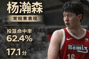 杨瀚森在常规赛出战了14场,投篮命中率62.4%,三分球32.1%,罚球命中率75%,场均17.1分9.2篮板3.1助攻0.7助攻1.6盖帽。