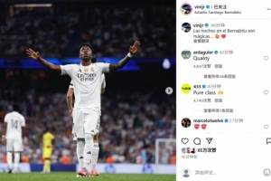 体育资讯10月5日讯 本轮西甲,皇马3-1黄潜。此役维尼修斯双响建功,赛后球员更新社媒庆祝胜利。