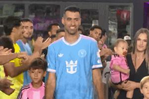 美职联迈阿密4-1新英格兰革命赛后,布斯克茨带着妻子和三个孩子参加退役仪式。