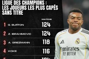 全文摘要:外媒统计了未夺欧冠球员的出场榜。布冯与伊布以124场并列第一,格列兹曼、科克等紧随其后。姆巴佩98场位列第九,展现了其丰富的欧冠征战经验。