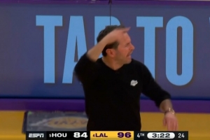 下一篇: 詹姆斯后仰跳投命中,自己都忍不住“呜呼”惊叹。