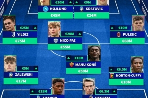 中场:伊尔迪兹(尤文,7500万欧元,+2500万欧元)、尼科-帕斯(科莫,5500万欧元,+2000万欧元)、马努-科内(罗马,5000万欧元,+1000万欧元)、普利西奇(米兰,6000万欧元,+1000万欧元)