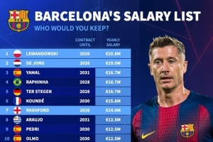 全文摘要:德国转会市场公布巴萨球员年薪榜。莱万多夫斯基以2080万欧居首,德容以1900万欧紧随其后。亚马尔、拉菲尼亚和特尔施特根并列第三,年薪均为1670万欧。这份排名清晰展示了巴萨队内的薪资结构分布。