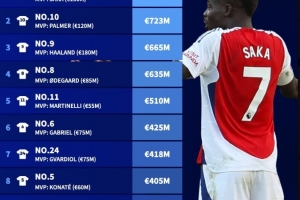 1、7号(萨卡,身价1.5亿欧):总市场价值7.71亿欧