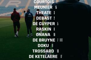 1-库尔图瓦、15-穆尼耶、3-泰特、2-德巴斯特、5-德屈佩、8-拉斯金、18-阿马杜-奥纳纳、7-德布劳内、11-多库、10-特罗萨德、17-德凯特拉雷