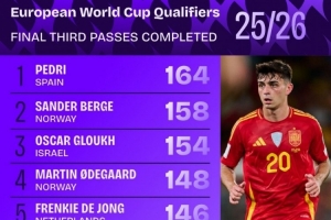 体育资讯10月15日讯 Squawka列出了欧洲世预赛进攻三区成功传球排名,西班牙中场佩德里居首。