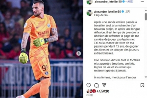 全文摘要:34岁前巴黎圣日耳曼门将莱特利尔宣布结束15年职业生涯。他感谢足球带来的热爱、友谊与荣耀,并向妻子、家人、俱乐部、工作人员及球迷表达诚挚谢意。他强调,这并非与足球的告别,而是一段美好篇章的结束,对足球的热爱将永存心中。