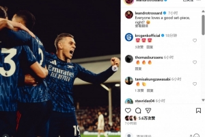 赛后特罗萨德也在个人社媒晒出庆祝进球照片,配文写道:“人人都爱高质量的定位球,难道不是吗😉”