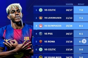 全文摘要:巴萨在欧冠6-1大胜奥林匹亚科斯,队史最大比分获胜纪录随之更新。该胜绩跻身队史欧冠大胜榜前列,榜上还有7-0凯尔特人、7-1勒沃库森等经典战役,彰显了巴萨在欧冠赛场的强大统治力。