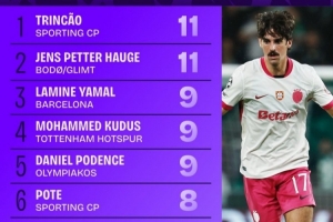 全文摘要:欧冠联赛阶段前三轮战罢,Squawka统计了完成过人榜单。葡萄牙体育前锋特林康与博德闪耀攻击手海于格均以11次成功过人并列榜首。巴塞罗那新星亚马尔、热刺的库杜斯和奥林匹亚科斯的波登斯以9次并列第三。