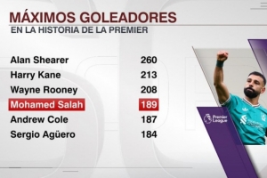 据ESPN统计,萨拉赫目前在英超打进189球,排名历史射手榜第四位,差19球追平排名第三的鲁尼。
