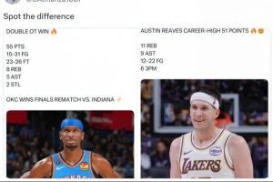 赛后美媒露天看台晒出了里夫斯的数据但没写上罚球数据,雷霆随队记者Clemente Almanza晒出了此前亚历山大对步行者砍下55分的比赛数据(有写上罚球罚球),改记者写道:“发现了区别。”