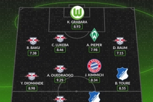 后卫:巴库(莱比锡,7.38分)、卢克巴(莱比锡,8.46分)、阿莫斯-皮佩尔(云达不莱梅,7.98分)、劳姆(莱比锡,7.15分)