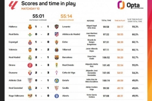 本轮西甲净比赛时长最多的是马洛卡vs莱万特,为59分17秒;净比赛时长最短的则是巴列卡诺vs阿拉维斯,仅48分31秒。