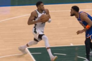 GIF-字母哥上篮,回放看明显走步了吧!