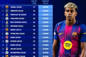 另有三位球员曾达到1.8亿欧元估值:贝林厄姆(2023年20岁时达成,保持至今)、内马尔(2018年25岁效力巴黎时)与梅西(2017年效力巴萨时期)。