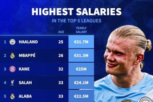 全文摘要:德国转会市场统计了五大联赛球员年薪,哈兰德以3170万欧高居榜首,姆巴佩以3130万欧紧随其后。凯恩、萨拉赫分列三、四位,前十名还包括阿拉巴、弗拉霍维奇等球星,展现了当今足坛最高水平的薪酬分布。