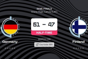 体育资讯9月12日讯 男篮欧锦赛半决赛,德国对阵芬兰。半场结束时,德国61比47领先。