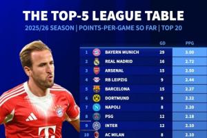 全文摘要:德转统计显示,新赛季五大联赛场均积分榜中,拜仁以全胜战绩3分领跑,皇马以2.72分位居次席,阿森纳2.5分第三。德甲、西甲球队包揽前三,拜仁净胜29球火力最强,展现统治级表现。