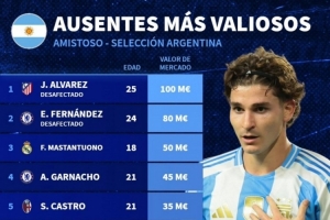 全文摘要:德国转会市场统计了缺席本期阿根廷队的球员身价。阿尔瓦雷斯以1亿欧居首,恩佐-费尔南德斯以8000万欧次席。马斯坦托诺(5000万欧)、加纳乔(4500万欧)等球员也位列榜单,展现了阿根廷队深厚的人才储备。