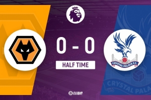伤停补时1分钟。上半场比赛结束,狼队0-0水晶宫。