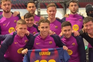 体育资讯11月27日讯 巴萨官推晒视频,费尔明获得了俱乐部百场里程碑球衣,并在队友的簇拥下展示了球衣。