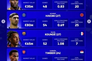 阿什拉夫(巴黎,27岁,摩洛哥):身价8000万欧,54场,场均0.69丢球,直接参与25球