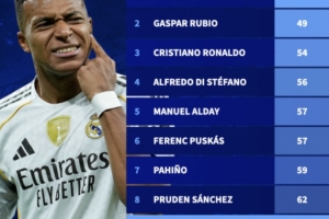 全文摘要:姆巴佩在欧冠对阵马赛的比赛中梅开二度,以64场达成皇马生涯50球里程碑,位列队史第50球场次排行榜第9位。