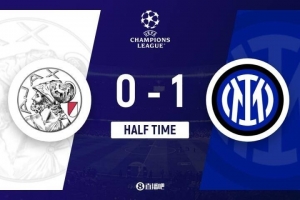 上半场伤停补时3分钟,半场结束,国米暂1-0阿贾克斯。