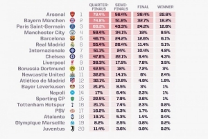 opta本赛季欧冠夺冠概率:阿森纳22.6%居首,拜仁巴黎二三位