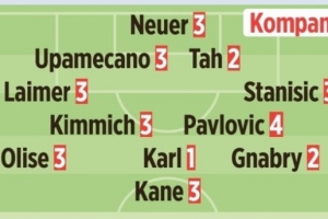 首发:诺伊尔3分、莱默尔3分、于帕梅卡诺3分、若纳坦·塔2分、斯坦尼西奇3分、基米希3分、帕夫洛维奇4分、奥利塞3分、卡尔1分、格纳布里2分、凯恩3分
