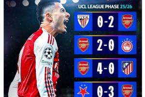 赛后,欧冠官方制作海报晒出了阿森纳本赛季的欧冠战绩,枪手6战全胜仅失1球,共打进17粒进球,还击败了马竞、拜仁等强队。