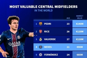 全文摘要:德国转会市场公布中场中路球员德转身价榜,佩德里以1.4亿欧高居榜首。赖斯与巴尔韦德并列第二,均估价1.2亿欧。若昂·内维斯、恩佐、麦卡利斯特紧随其后,身价均在8500万欧以上。该榜单反映了当前足坛顶级中场球员的市场价值。