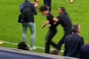 比赛结束后,获得全场最佳奖项的拉什福德正配合拍照时,《太阳报》拍摄到两名冲入球场的球迷被安保强制带离。