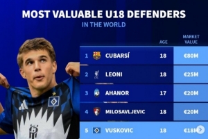 体育资讯12月17日讯 《转会市场》统计了当前U18后卫身价情况,库巴西以8千万欧元断崖领跑。