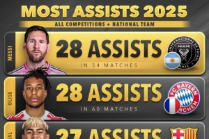 以下是2025年年度助攻榜单(俱乐部+国家队各项赛事):