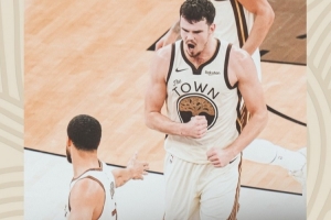 赛后勇士官方晒出赢球海报,封面为库里+波斯特庆祝的一幕。