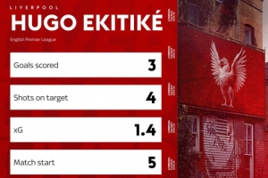 据媒体统计,埃基蒂克英超开局5场比赛皆首发出战,射正5次,预期进球1.4粒,打进3球。